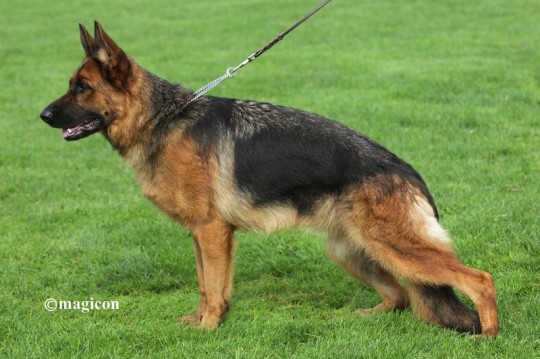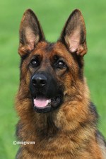 2007SZ 2208401 HD-SV: HD a-normal (a1) Sire Groß, mittelkräftig, gehaltvoll, sehr gut pigmentiert, besonders ausdrucksvoll. Geprägestarker Kopf, harmonische Ober- und Unterlinie, sehr gute Gefügefestigkeit, ausgeprägter Widerrist, richtig gelagerte Kruppe, ausgereifte Brustverhältnisse, sehr gute Winkelungen der Vor- und Hinterhand, gerade tretendes, weit ausgreifendes Gangwerk, gute Gleichgewichtslage. Wesen sicher, TSB ausgeprägt, läßt ab. Sehr harmonisch aufgebauter Rüde mit lobenswertem Gepräge und Ausdruck. |